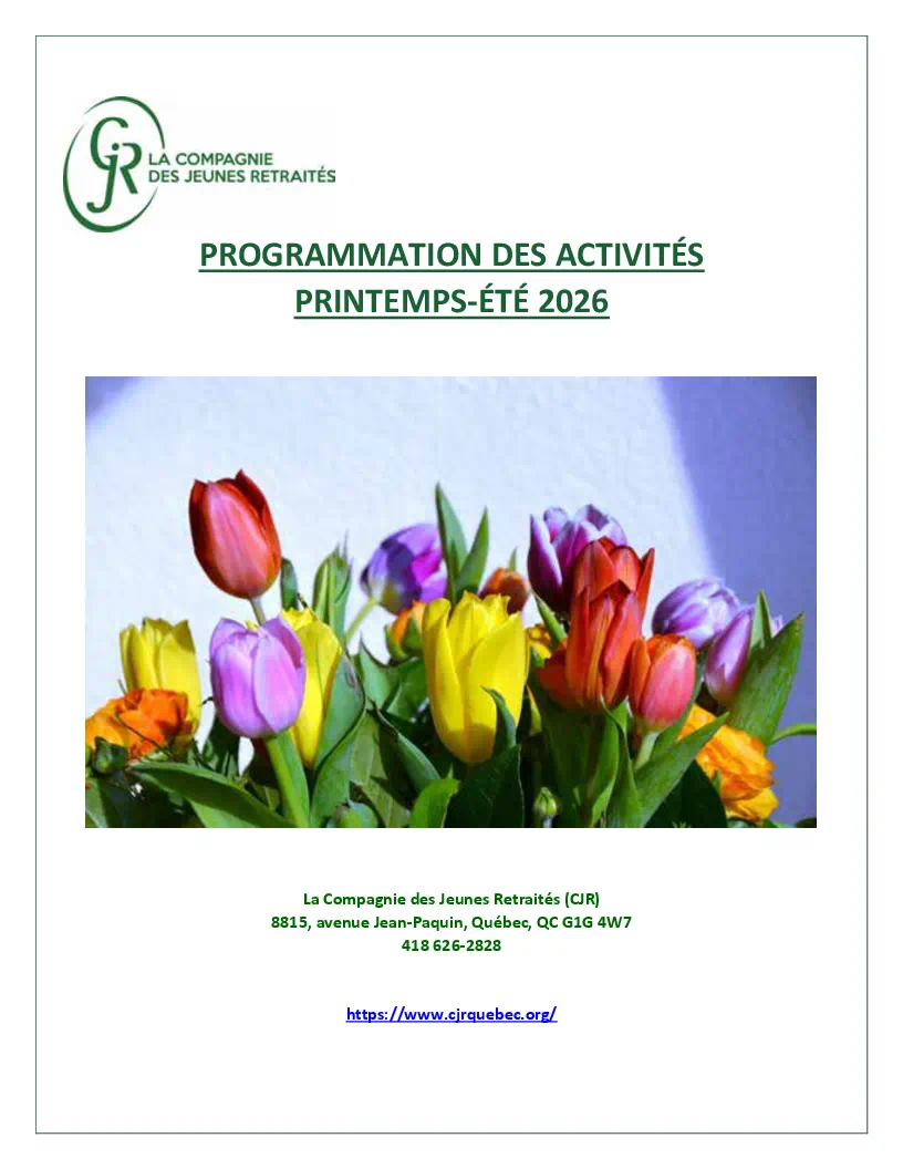 Accueil LA CJR OFFRE DES ACTIVITÉS AUX GENS DE LA VILLE DE QUÉBEC ET DES ENVIRONS Porte ouverte lundi le 27 avril (13h à 15h) - Distribution de la Programmation - Activités Printemps/été Utilisez le menu vert ci-dessus pour trouver vos informations À propos de la CJR HistoriqueMission et Valeur Publication Annuelle Info CJR 2024 (Édition 30e anniversaire) POUR ACCÉDER AU SITE WEB RÉSERVÉ AUX MEMBRES ou SI VOUS ÊTES MEMBRE ET VOUS SOUHAITEZ RENOUVELER VOTRE ADHÉSION, CONNECTEZ-VOUS À LA PLATEFORME CJR DEVENEZ MEMBRE DÈS MAINTENANT!