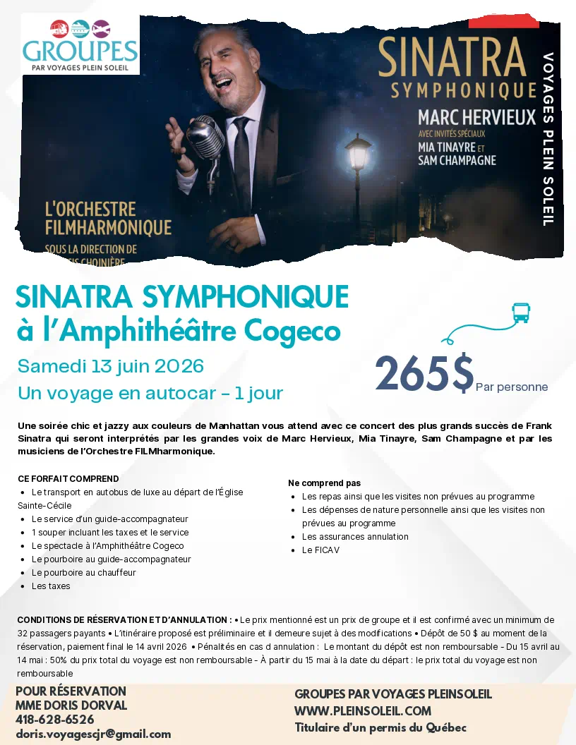 SORTIES D’UNE JOURNÉE Sorties d'une Journée Lise Dubé Coordonnatrice Règlements de Groupe Voyages Québec 31 mars 2026 Flyer Radio-Canada et Centre Bell Anne Picard 10 avrll 2026 Demande de Réservation Flyer Géants de la Chanson Française Dany Garneau 27 avril 2026 Demande de Réservation Flyer Casino de Charlevoix Josée Godin 19 mai 2026 Demande de Réservation Flyer L’Usine Prévost 189,00 $ Anne Picard 29 mai 2026 Demande de Réservation Flyer Brunch Pop-Retro Anne Picard 13 juin 2026 Demande de Réservation Flyer Sinatra CJR 2026 Doris Dorval 27 juin 2026 Demande de Réservation Flyer Monsieur le Maire Théâtre La Marjolaine Anne Picard 16 juillet 2026 Demande de Réservation Flyer Fabuleuse Histoire d’un Royaume R-M Cloutier 4 août 2026-Demande de Réservation Flyer-Cloutier Rose-Marie - Tropicana Magog 20 août 2026 Demande de Réservation Flyer Croisière sur la Rivière Malbaie + Bootlegger R-M Cloutier