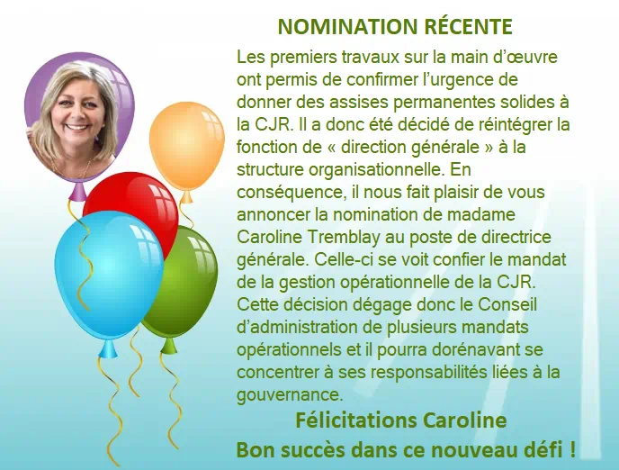 Il nous fait plaisir de vous présenter le Conseil d’administration 2025 qui veillera à la pérennité et au développement de la CJR (Cliquer ici).
