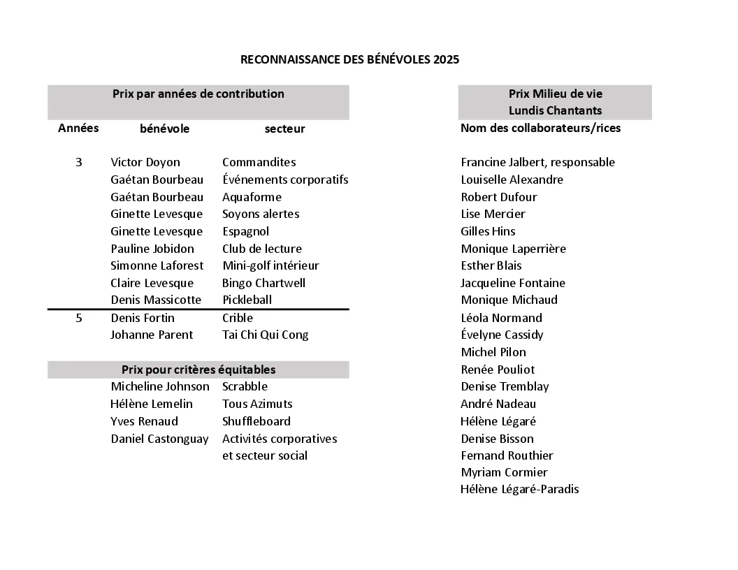 En hommage à nos bénévoles, nous remercions collectivement tous ceux et celles qui ont collaboré à l’organisation de cette soirée.