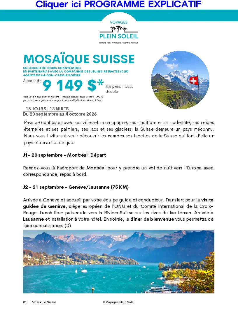 • Fin septembre-octobre : Beautés Suisse, Carole Poirier (Circuits de 15 jours-13 nuits)