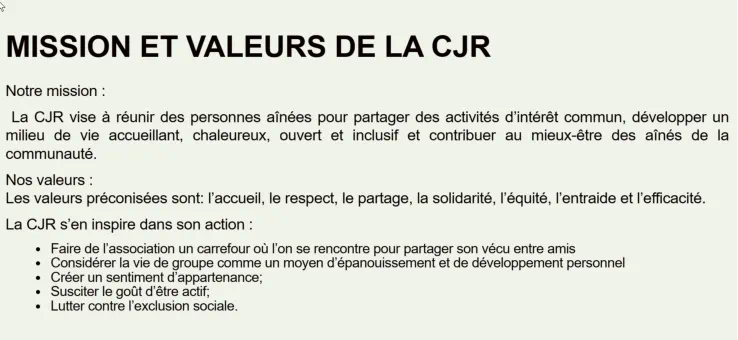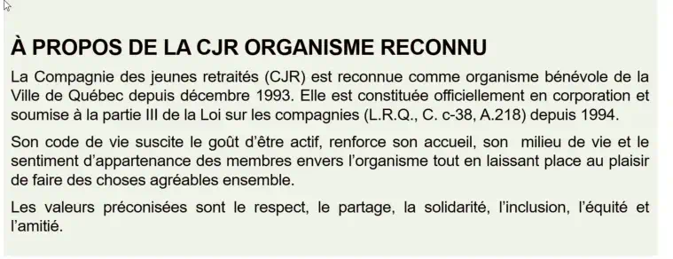 Accueil LA CJR OFFRE DES ACTIVITÉS AUX GENS DE LA VILLE DE QUÉBEC ET DES ENVIRONS L'inscription aux activités de l'automne 2025 débute le 9 septembre à 9 heures, via la Plateforme d'inscription CJR! Utilisez le menu vert ci-dessus pour trouver vos informations À propos de la CJR HistoriqueMission et Valeur Publication Annuelle Info CJR 2024 (Édition 30e anniversaire)Adresse temporaire de la CJR (750, rue de la Sorbonne), cliquez ici POUR ACCÉDER AU SITE WEB RÉSERVÉ AUX MEMBRES ou SI VOUS ÊTES MEMBRE ET VOUS SOUHAITEZ RENOUVELER VOTRE ADHÉSION, CONNECTEZ-VOUS À LA PLATEFORME CJR DEVENEZ MEMBRE DÈS MAINTENANT!
