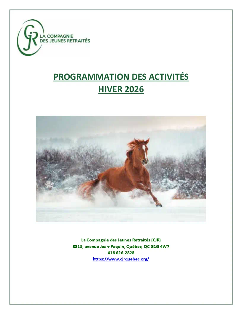 Accueil LA CJR OFFRE DES ACTIVITÉS AUX GENS DE LA VILLE DE QUÉBEC ET DES ENVIRONS Activités Hiver 2026 - Inscription "Mardi 6 janvier 9hrs" - Cliquer ici Utilisez le menu vert ci-dessus pour trouver vos informations À propos de la CJR HistoriqueMission et Valeur Publication Annuelle Info CJR 2024 (Édition 30e anniversaire) POUR ACCÉDER AU SITE WEB RÉSERVÉ AUX MEMBRES ou SI VOUS ÊTES MEMBRE ET VOUS SOUHAITEZ RENOUVELER VOTRE ADHÉSION, CONNECTEZ-VOUS À LA PLATEFORME CJR DEVENEZ MEMBRE DÈS MAINTENANT! Avantage membre