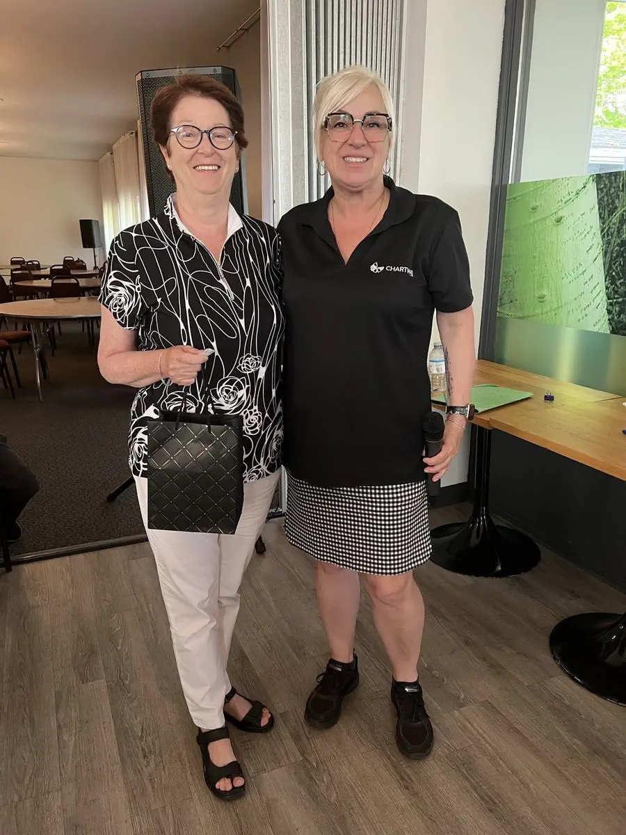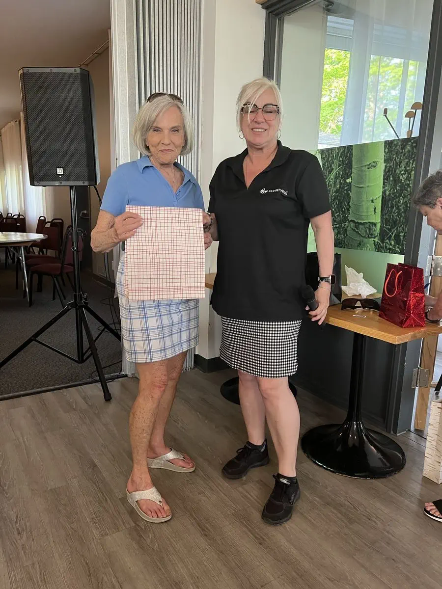 Louise Gagnon de Chartwell (à droite sur les photos) remet un certificat cadeau de 100 $ de Golf-Town aux gagnantes du tirage de la compétition de coups roulés. Les heureuses gagnantes :
