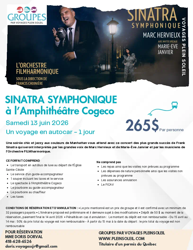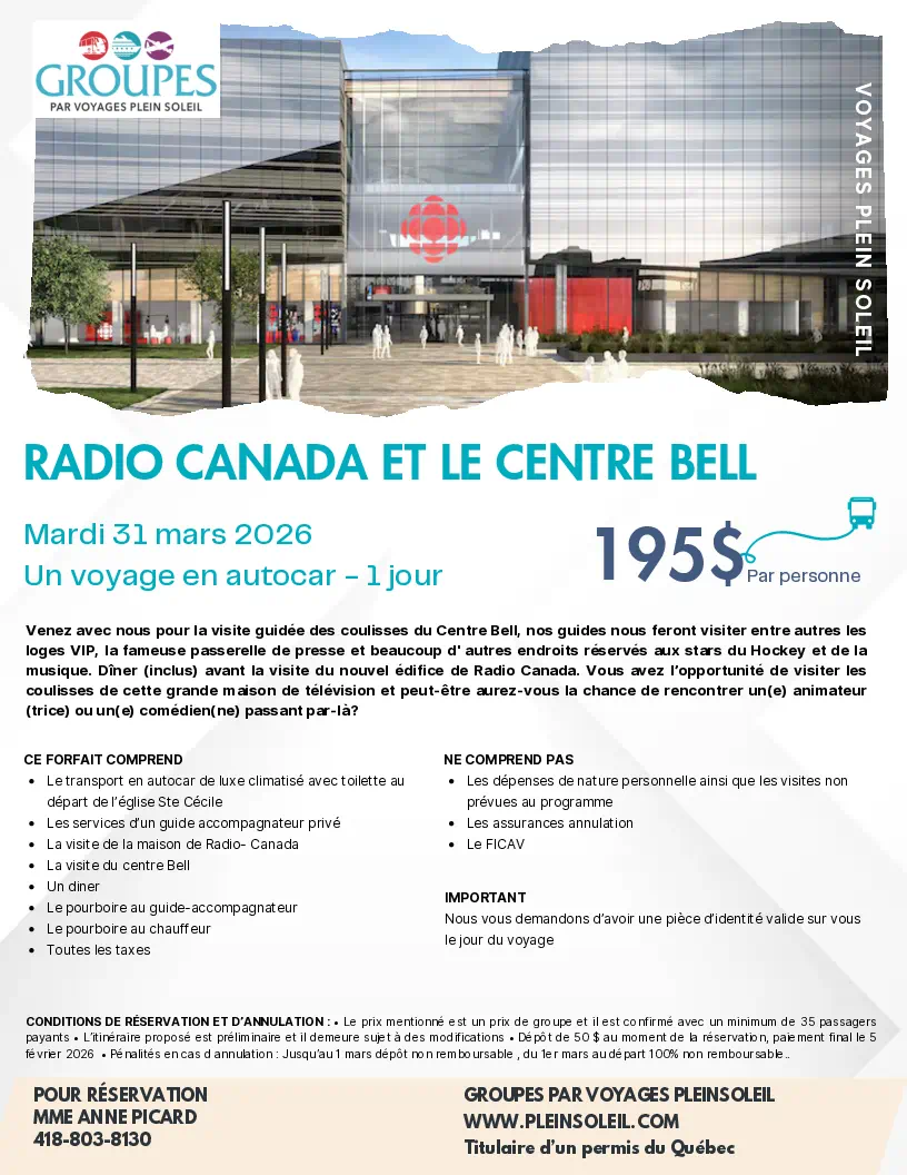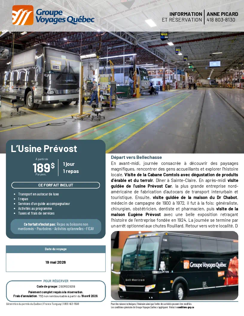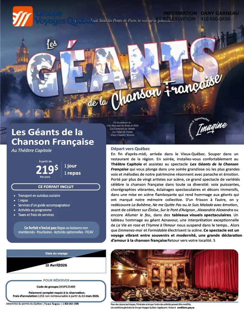SORTIES D’UNE JOURNÉE Sorties d'une Journée Lise Dubé Coordonnatrice Règlements de Groupe Voyages Québec 10 avrll 2026 Demande de Réservation Flyer Géants de la Chanson Française Dany Garneau 27 avril 2026 Demande de Réservation Flyer Casino de Charlevoix Josée Godin 31 mars 2026 Flyer Radio-Canada et Centre Bell Anne Picard 19 mai 2026 Demande de Réservation Flyer L’Usine Prévost 189,00 $ Anne Picard 29 mai 2026 Demande de Réservation Flyer Brunch Pop-Retro Anne Picard 13 juin 2026 Demande de Réservation Flyer Sinatra CJR 2026 Doris Dorval 27 juin 2026 Demande de Réservation Flyer Monsieur le Maire Théâtre La Marjolaine Anne Picard 16 juillet 2026 Demande de Réservation Flyer Fabuleuse Histoire d’un Royaume R-M Cloutier 4 août 2026-Demande de Réservation Flyer-Cloutier Rose-Marie - Tropicana Magog 20 août 2026 Demande de Réservation Flyer Croisière sur la Rivière Malbaie + Bootlegger R-M Cloutier