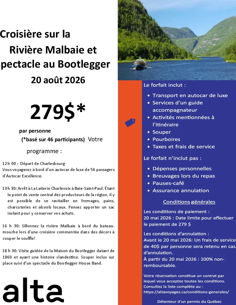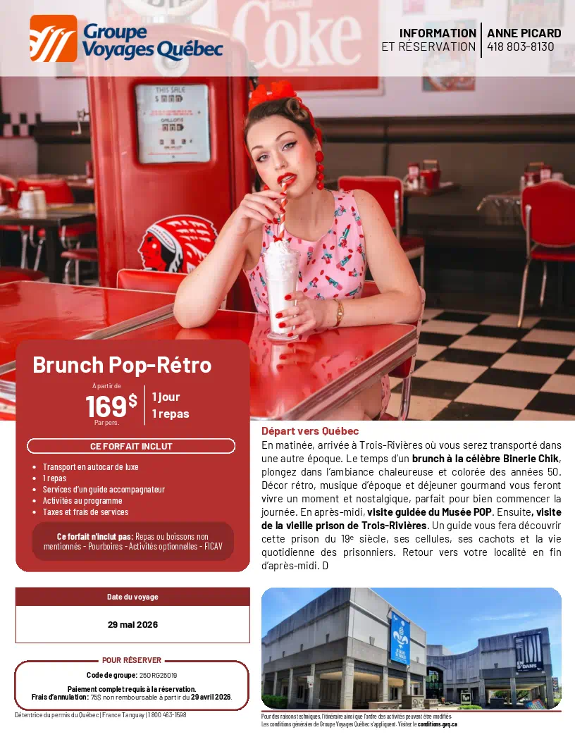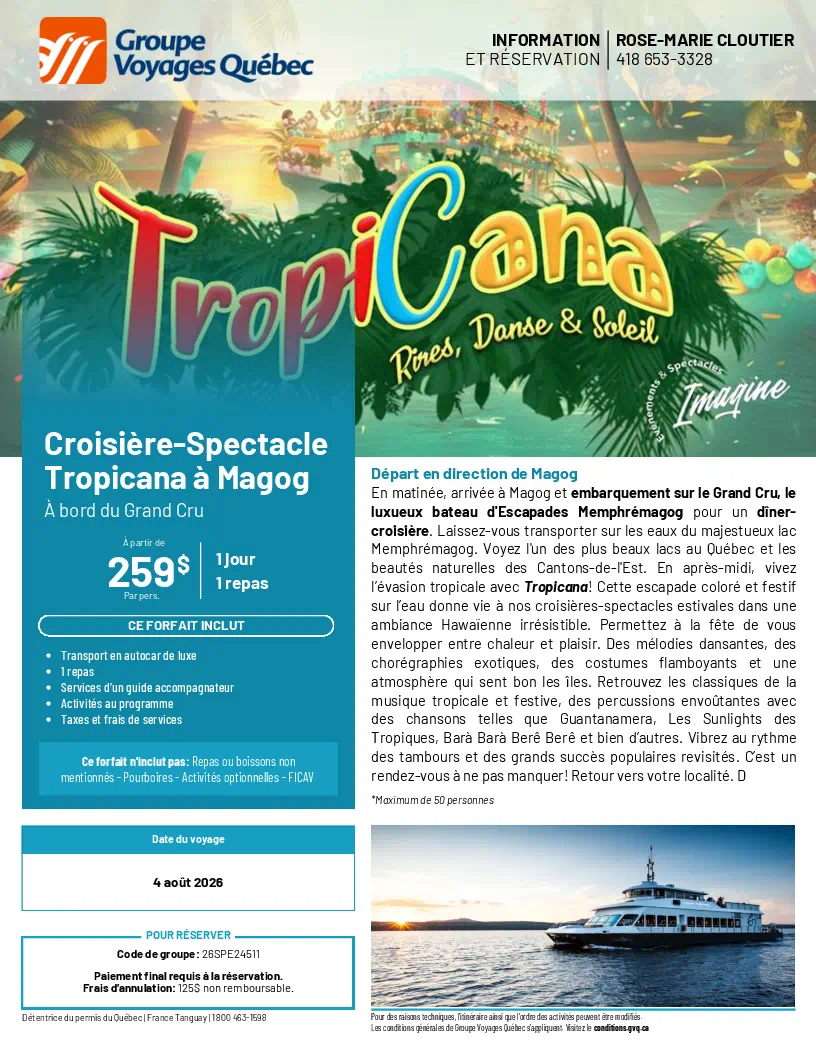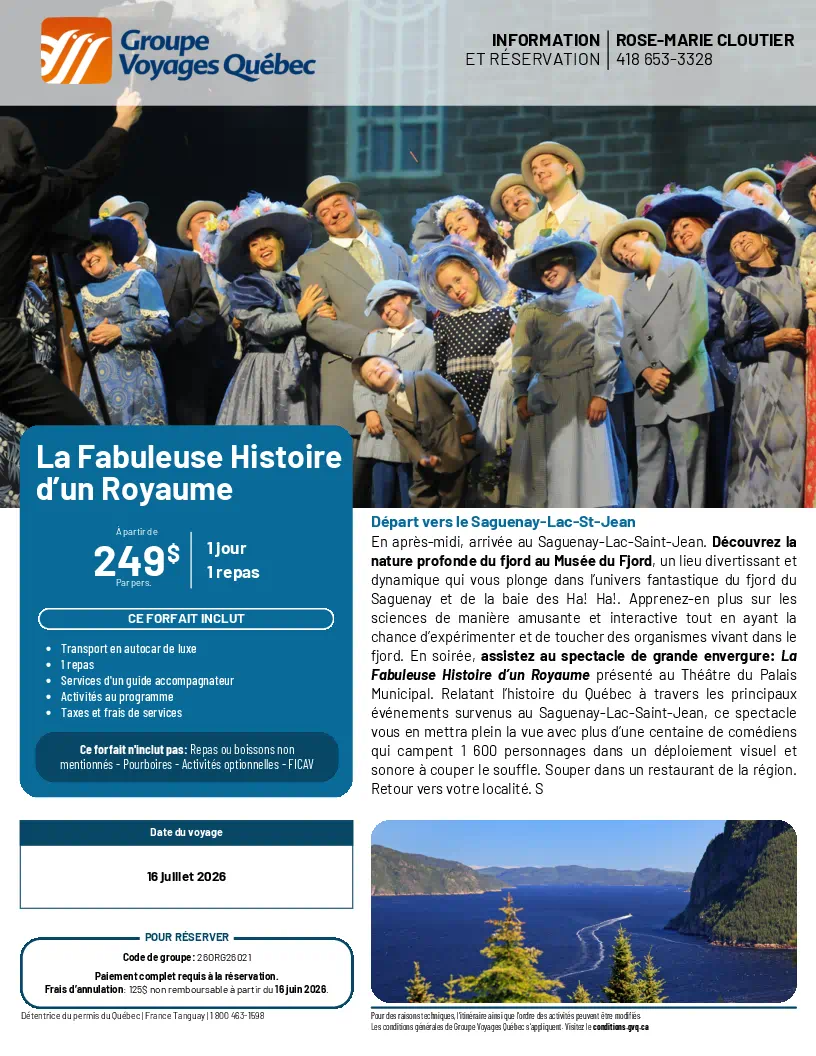 SORTIES D’UNE JOURNÉE Sorties d'une Journée Lise Dubé Coordonnatrice Règlements de Groupe Voyages Québec 10 avrll 2026 Demande de Réservation Flyer Géants de la Chanson Française Dany Garneau 27 avril 2026 Demande de Réservation Flyer Casino de Charlevoix Josée Godin 31 mars 2026 Flyer Radio-Canada et Centre Bell Anne Picard 19 mai 2026 Demande de Réservation Flyer L’Usine Prévost 189,00 $ Anne Picard 29 mai 2026 Demande de Réservation Flyer Brunch Pop-Retro Anne Picard 13 juin 2026 Demande de Réservation Flyer Sinatra CJR 2026 Doris Dorval 27 juin 2026 Demande de Réservation Flyer Monsieur le Maire Théâtre La Marjolaine Anne Picard 16 juillet 2026 Demande de Réservation Flyer Fabuleuse Histoire d’un Royaume R-M Cloutier 4 août 2026-Demande de Réservation Flyer-Cloutier Rose-Marie - Tropicana Magog 20 août 2026 Demande de Réservation Flyer Croisière sur la Rivière Malbaie + Bootlegger R-M Cloutier