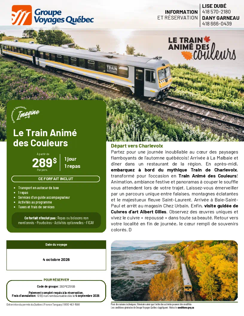 SORTIES D’UNE JOURNÉE Sorties d'une Journée Lise Dubé Coordonnatrice Règlements de Groupe Voyages Québec 27 avril 2026 Demande de Réservation Flyer Casino de Charlevoix Josée Godin 27 avril 2026 LISTE D'ATTENTE Flyer Casino de Charlevoix Josée Godin 19 mai 2026 Demande de Réservation Flyer L’Usine Prévost 189,00 $ Anne Picard 13 juin 2026 Demande de Réservation Flyer Sinatra CJR 2026 Doris Dorval 27 juin 2026 Demande de Réservation Flyer Monsieur le Maire Théâtre La Marjolaine Anne Picard 16 juillet 2026 Demande de Réservation Flyer Fabuleuse Histoire d’un Royaume R-M Cloutier 4 août 2026-Demande de Réservation Flyer-Cloutier Rose-Marie - Tropicana Magog 20 août 2026 Demande de Réservation Flyer Croisière sur la Rivière Malbaie + Bootlegger R-M Cloutier Complet 20 août 2026 LISTE D'ATTENTE Flyer Croisière sur la Rivière Malbaie + Bootlegger R-M Cloutier 4 octobre 2026-Demande de Réservation Flyer Train Animé des Couleurs Dany Garneau